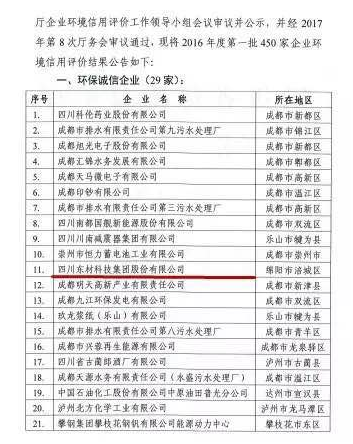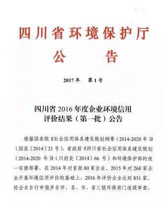 7月21日,四川省環(huán)境保護廳發(fā)布2017年第1號公告,公布了2016年度第一批企業(yè)環(huán)境信用評價結(jié)果。在全省申報的851家企業(yè)中,包括四川東材科技集團股份有限公司在內(nèi)的29家企業(yè)獲得四川省2016年度“環(huán)境誠信企業(yè)”稱號。