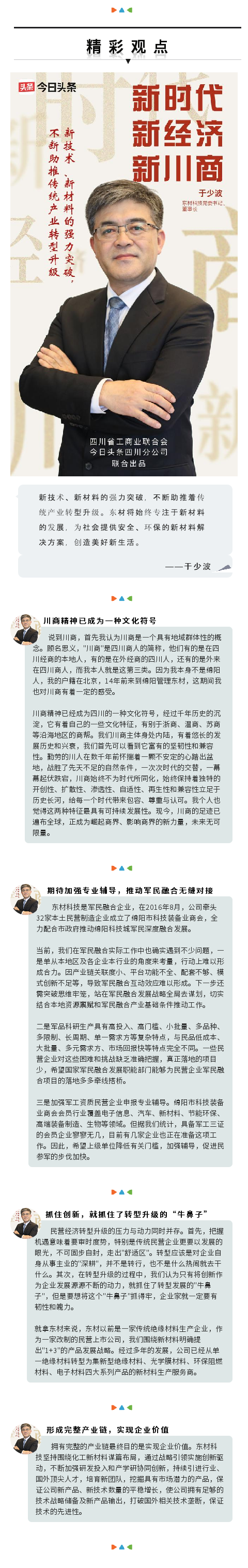 作為川內(nèi)新材料行業(yè)的排頭兵、國(guó)內(nèi)絕緣材料企業(yè)領(lǐng)軍企業(yè)的帶頭人,日前,四川東材科技集團(tuán)股份有限公司公司黨委書(shū)記、董事長(zhǎng)于少波作為新川商代表接受了《今日頭條》的專訪,分享了他對(duì)于新川商、軍民融合產(chǎn)業(yè)發(fā)展、民營(yíng)企業(yè)轉(zhuǎn)型升級(jí)的看法以及未來(lái)規(guī)劃等內(nèi)容。
