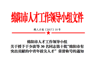 于少波董事長榮獲第十批“綿陽市有突出貢獻的中青年拔尖人才”榮譽稱號7月5日,綿陽市委、市政府批準授予我公司董事長于少波第十批“綿陽市有突出貢獻的中青年拔尖人才”榮譽稱號。該稱號的授予,充分肯定了于董在加快科技城建設(shè)和推進綿陽經(jīng)濟社會事業(yè)發(fā)展中所做出的突出貢獻。